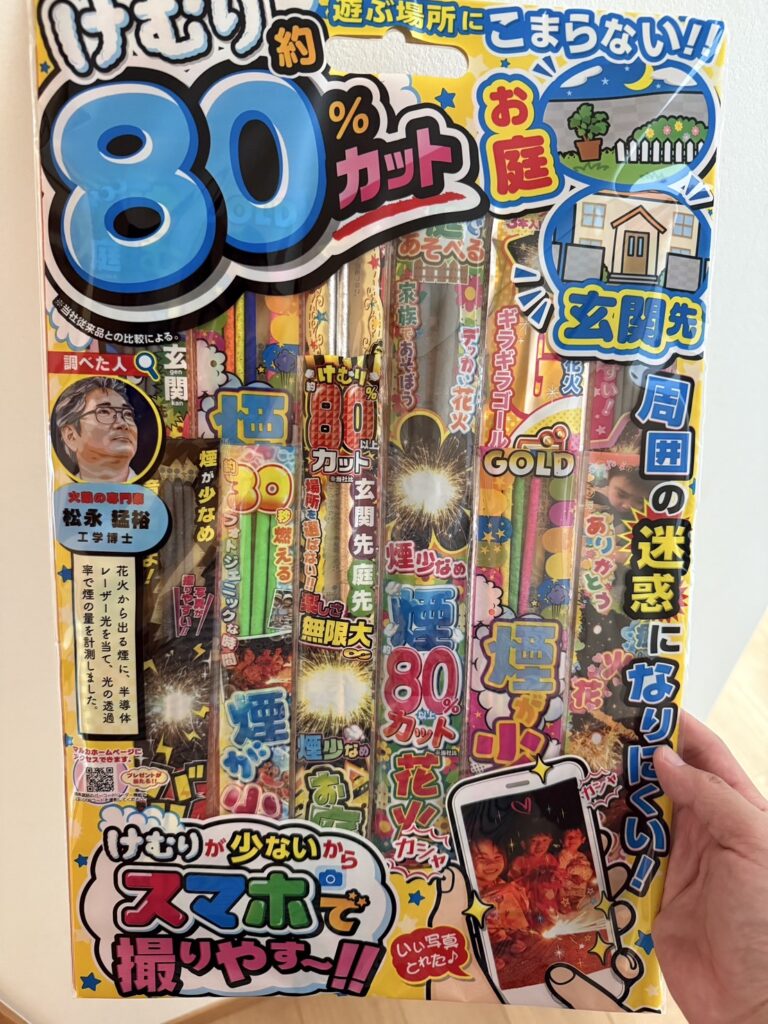 最近の花火は、住宅地でもやりやすいように、煙の量が調整されています。なので駐車場でやっても煙はあまり出ず、近隣への影響も最小限にできております。